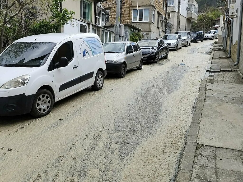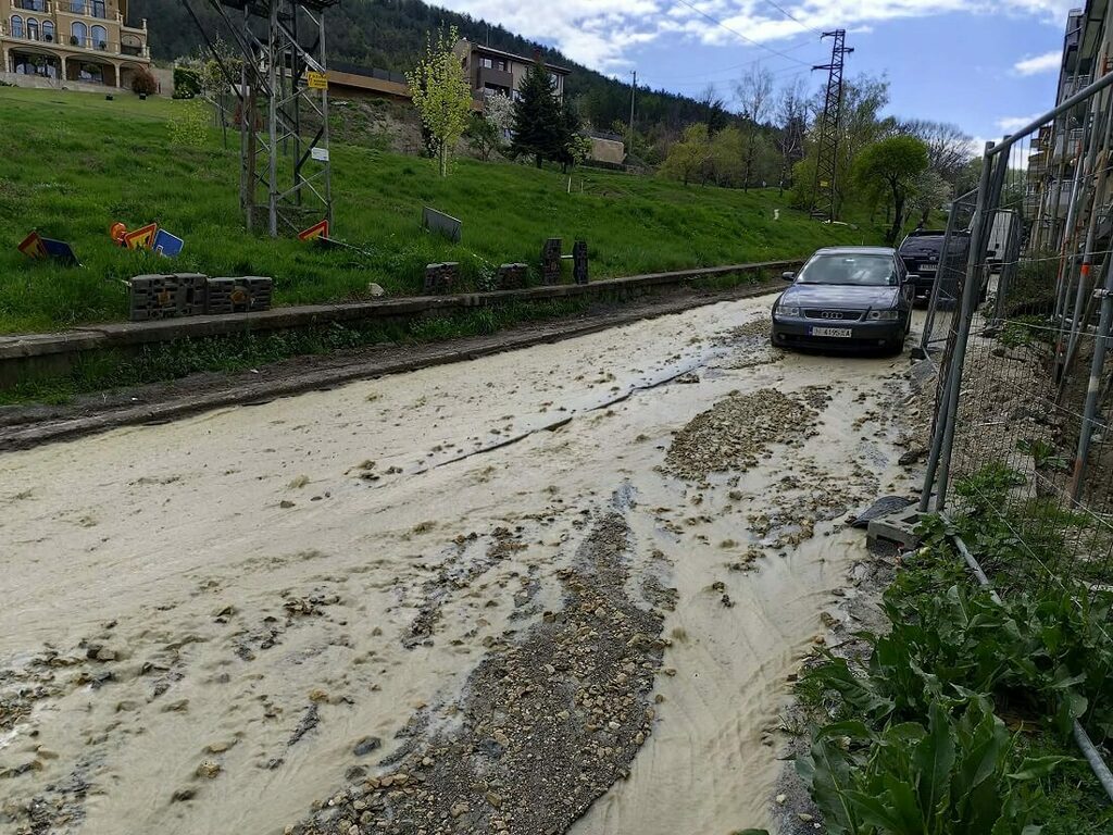Междувременно снимки във Фейсбук показват как част от калната вода вече е стигнала и до пешеходната зона под сградата на полицията. Силна вода в ранния следобед течеше и по улиците „Крум Арнаудов“ и „Васил Петлешков“.